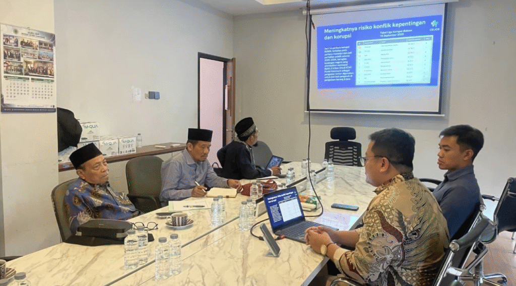 JAKARTA, MUI.OR.ID — The Indonesian Ulema Council’s (MUI) Fatwa Commission received a visit from the Center of Economic and Law Studies (Celios) to discuss a request for a fatwa on the salaries of ministers and deputy ministers holding concurrent positions as commissioners at state-owned enterprises (SOEs). The meeting took place at MUI office on Thursday (18/9).